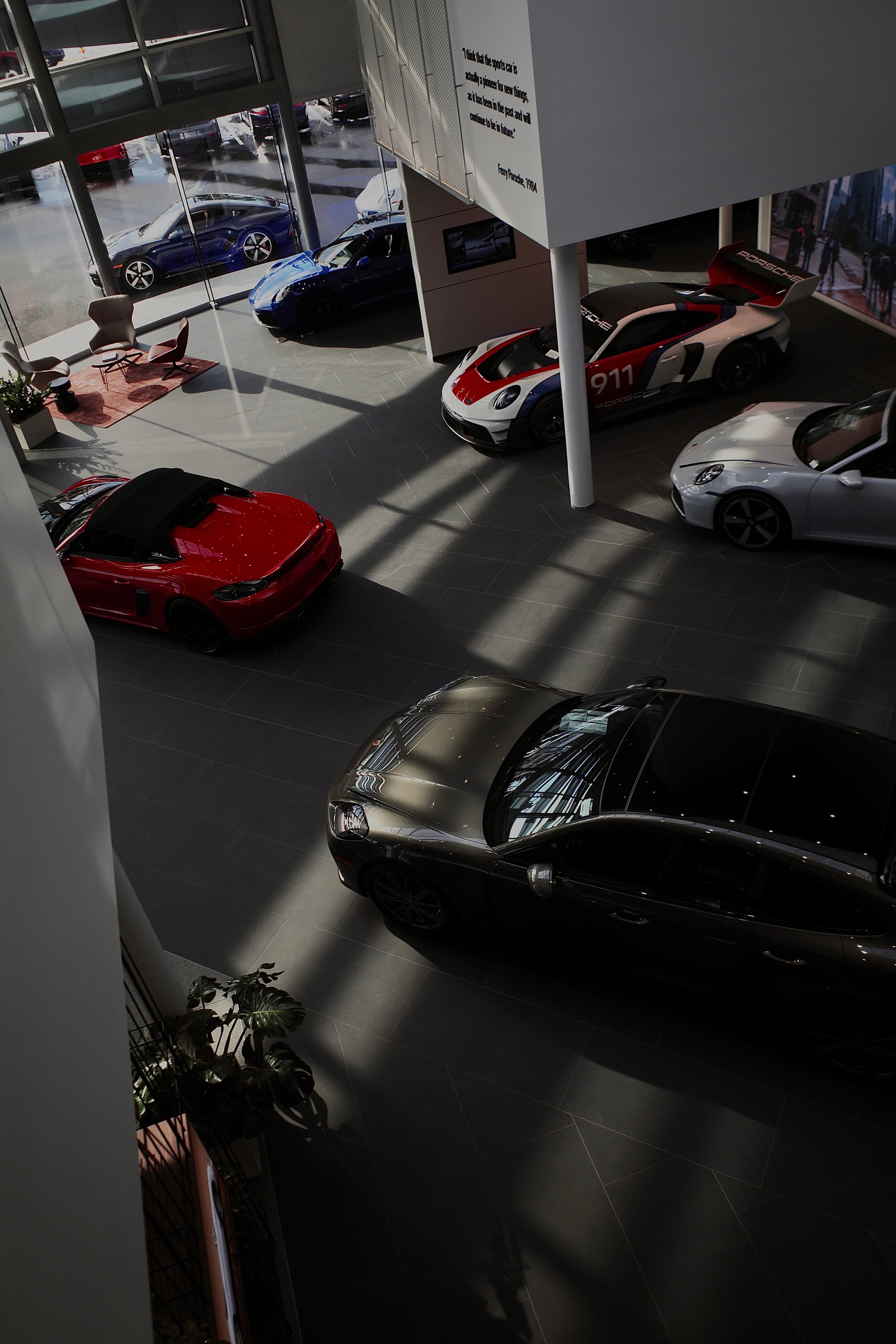 One wall was floor-to-ceiling glass overlooking the showroom — Guards Red 911s, Gulfblue Caymans positioned like sculptures. The side of aspiration.
